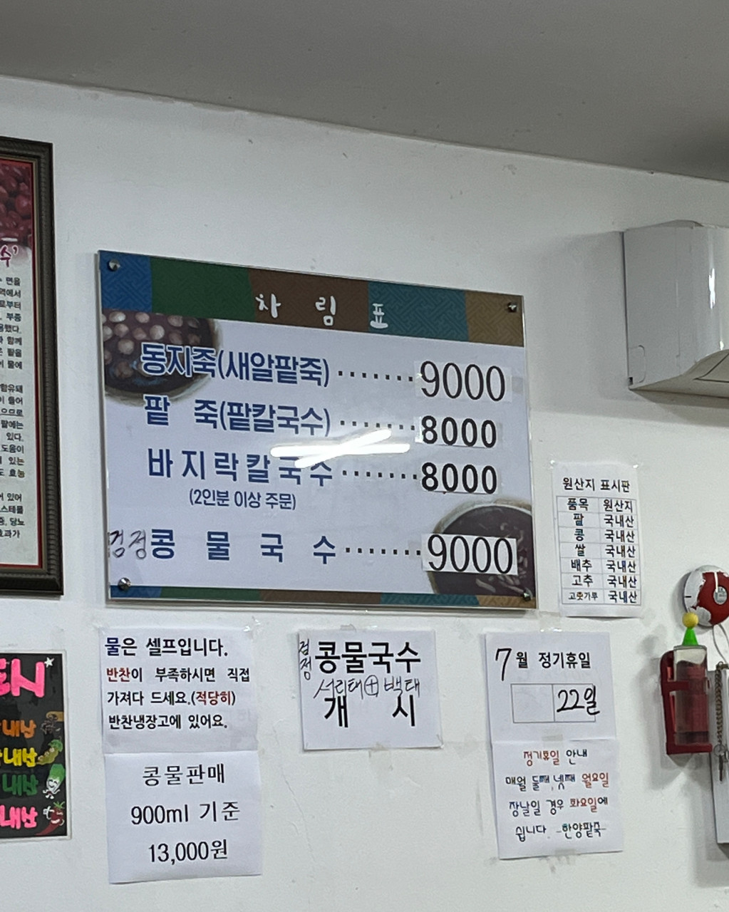 '한양팥죽'의 메뉴판은 단출하지만, 각 계절을 대표하는 음식들로 알차게 채워져 있습니다. 동지팥죽, 팥칼국수, 바지락칼국수, 그리고 여름 별미인 콩물국수까지, 네 가지 메뉴는 저마다의 매력으로 손님들을 맞이합니다. 이곳의 대표 주자는 단연 '동지팥죽'과 '팥칼국수'입니다. 솥에서 뭉근하게 끓여낸 팥죽은 인위적인 단맛 없이 팥 본연의 진하고 구수한 풍미가 일품입니다. 취향에 따라 소금이나 설탕을 더하면, 어릴 적 할머니가 끓여주시던 추억의 맛이 완성됩니다. 팥죽 속 쫀득한 새알심, 혹은 팥 국물에 부드럽게 말아진 칼국수 면발은 든든한 한 끼 식사로 부족함이 없습니다. 뜨끈한 국물이 부담스러운 여름철에는 시원한 '콩물국수'가 기다리고 있습니다. 100% 국산 콩을 갈아 만든 콩물은 걸쭉하고 고소한 맛이 그야말로 진국입니다. 쫄깃한 면발과 어우러져 무더위에 지친 입맛과 기력을 단번에 되찾아 줍니다. 또한, 사계절 내내 사랑받는 '바지락칼국수'는 푸짐한 바지락이 만들어내는 시원하고 깔끔한 국물 맛으로 속을 개운하게 풀어줍니다.